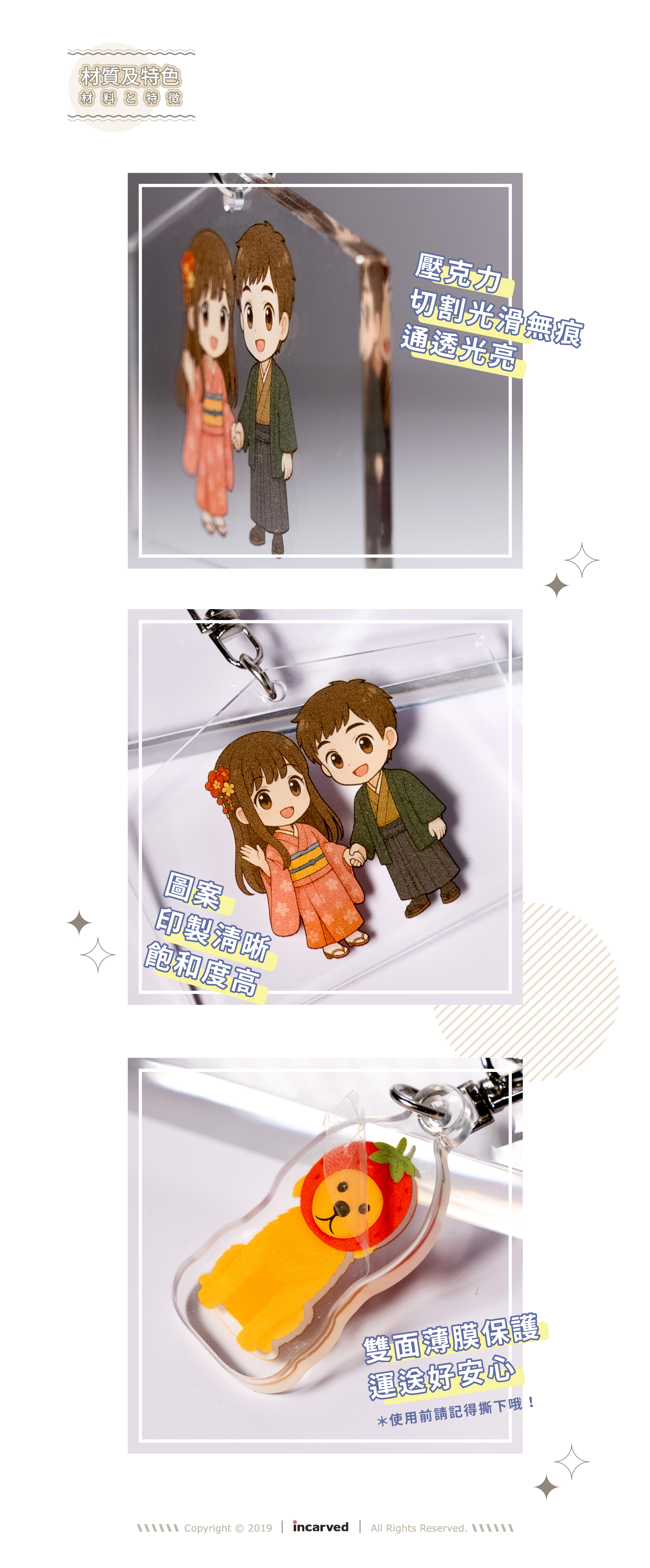 • 壓克力加工:上光、浮雕、上光+浮雕 會於局部加工,圖檔如沒有指定將會由我們幫您製作適合位置,如需要指定位置請製作黑稿圖層(如上光+浮雕,請分