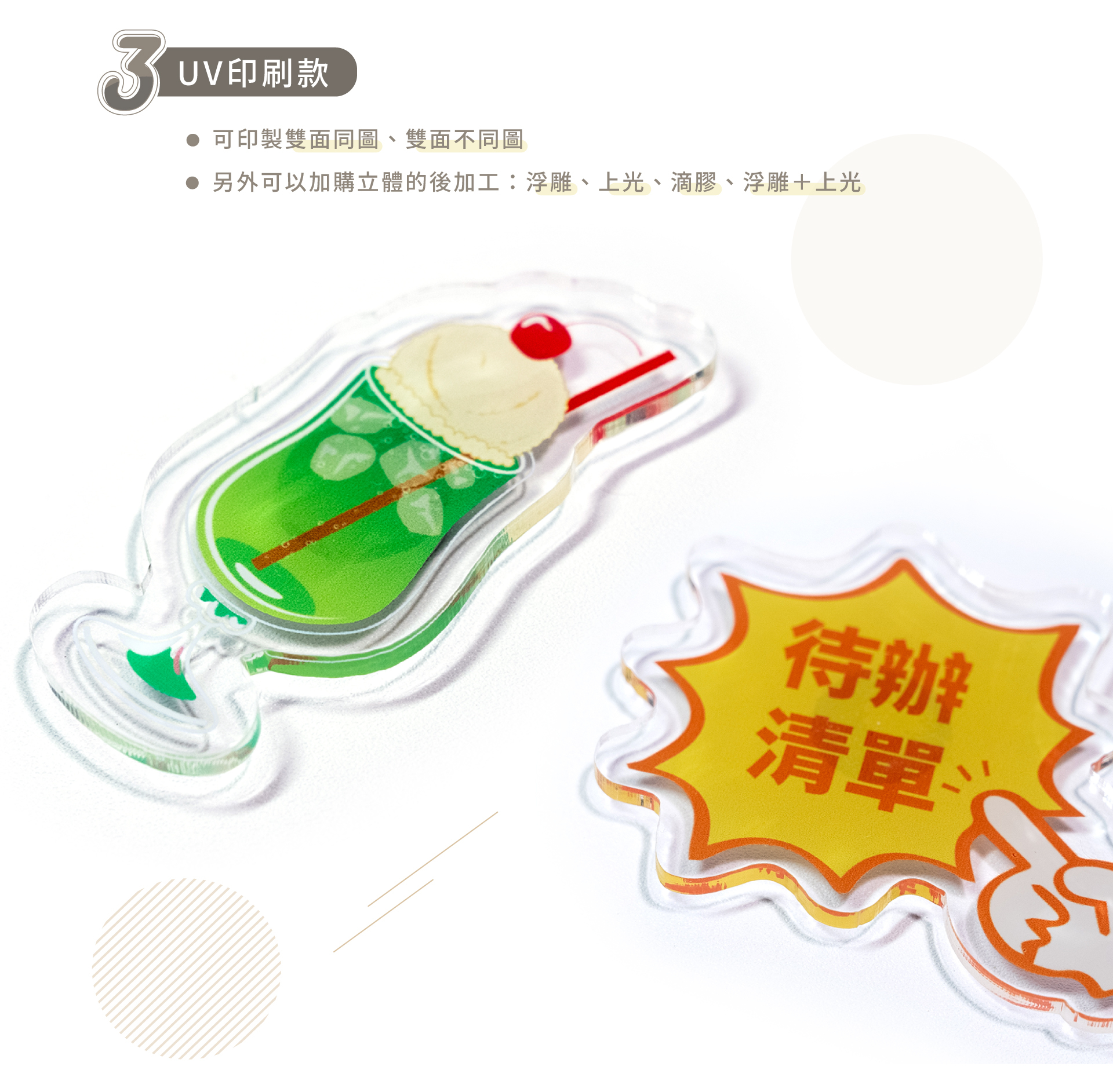 壓克力商品請留意:較不建議滿版印刷,邊緣容易因碰撞造成顏色脫落,如仍需求滿版印刷將無法因此理由退換商品。