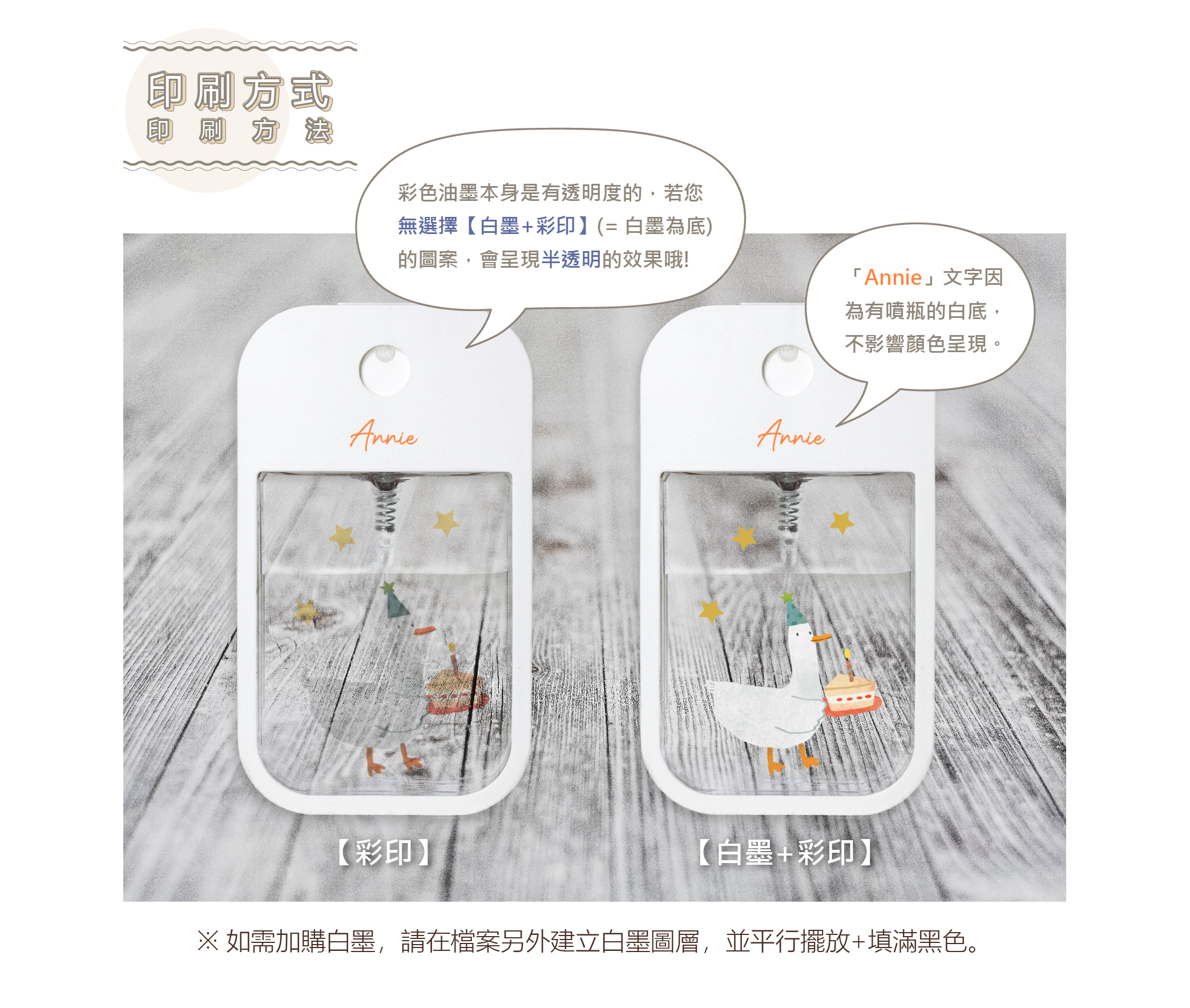 • 提醒您,直噴印刷是手工對位,難免會有些許偏移,故請避免線條延成品邊緣的設計。