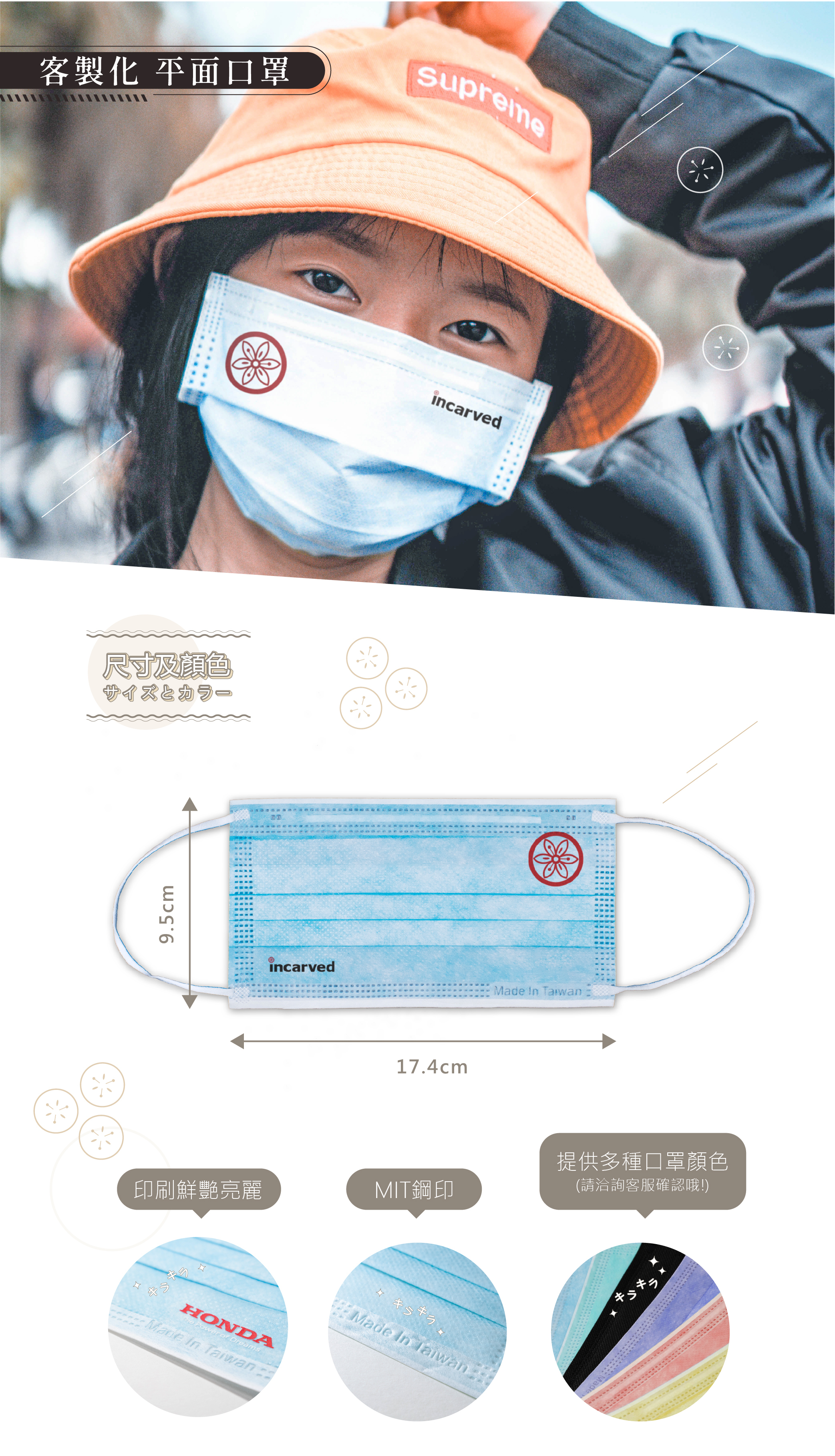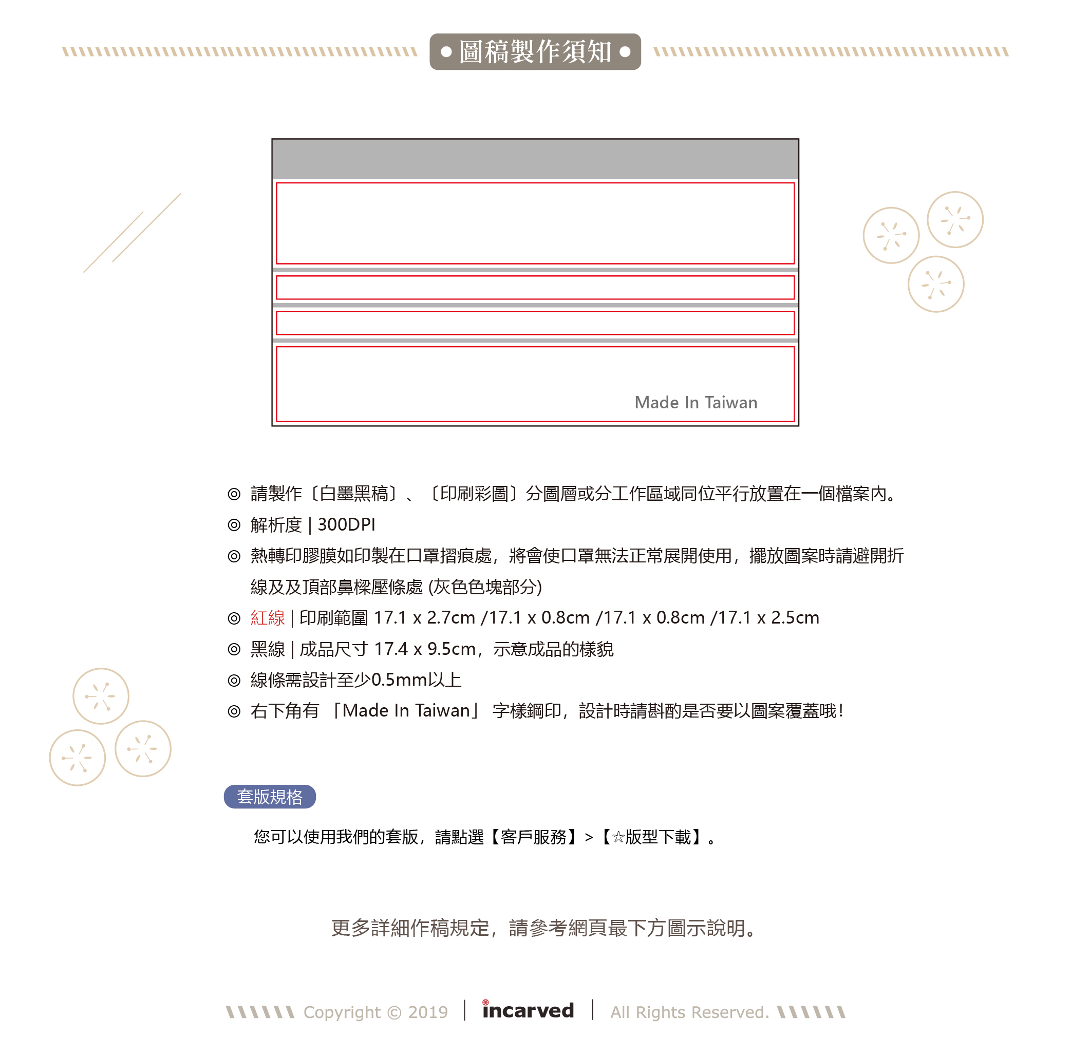 • 為避免檔案製作錯誤導致口罩無法正常使用,請使用我們的套版製作,印刷範圍請參考套版。