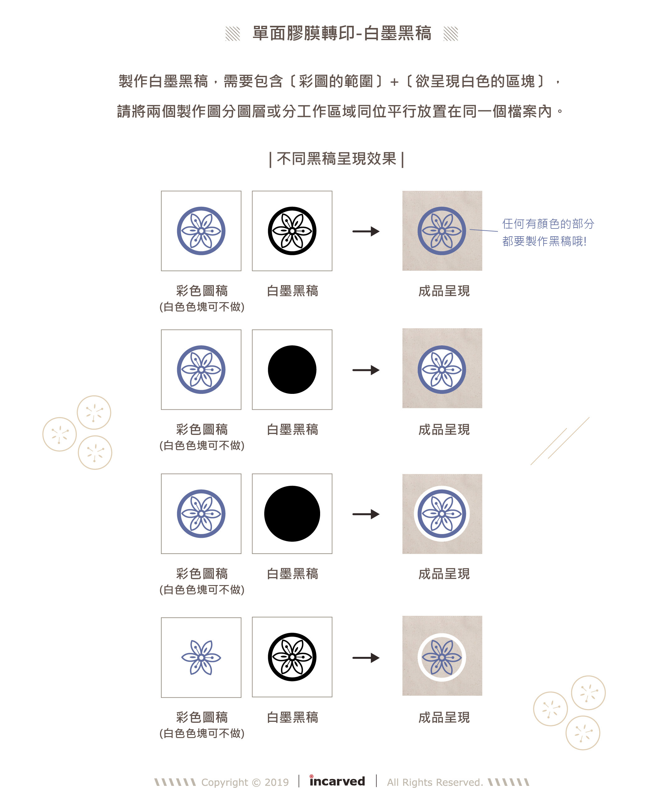 • 因油墨本身具透明度,因此印刷圖稿需製作:彩圖稿、底部白墨黑稿