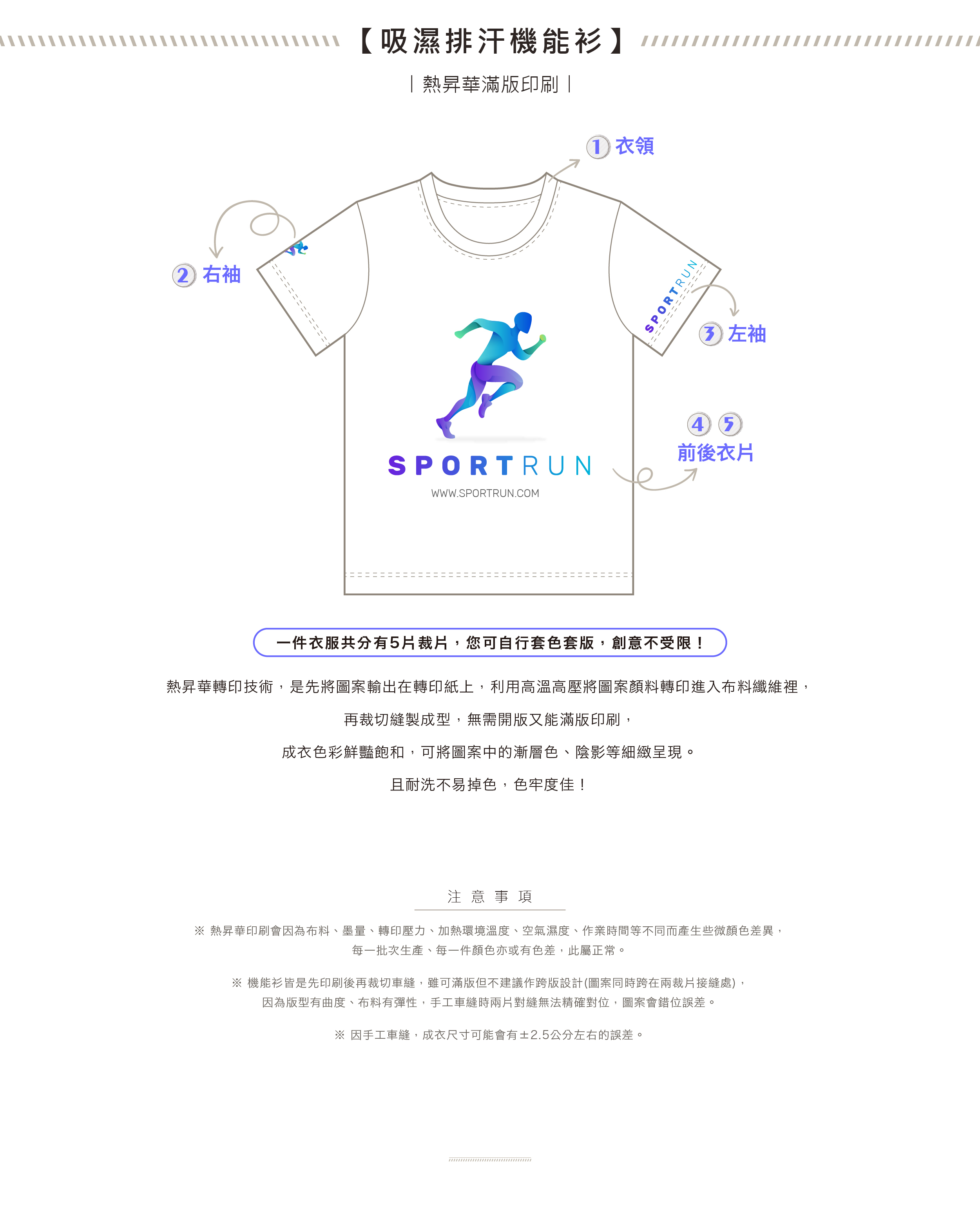 • 熱昇華印刷會因為布料、墨量、轉印壓力、加熱環境濕度、溫度不同而產生些微顏色差異,是無法校對色彩的,請勿提供Pantone或其他色票要求核對。