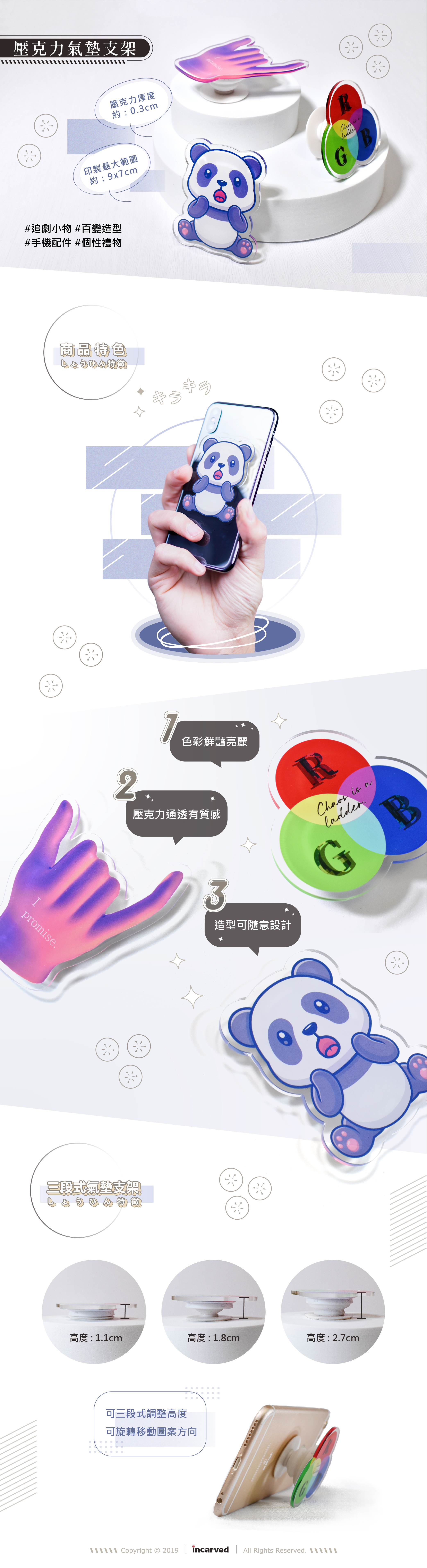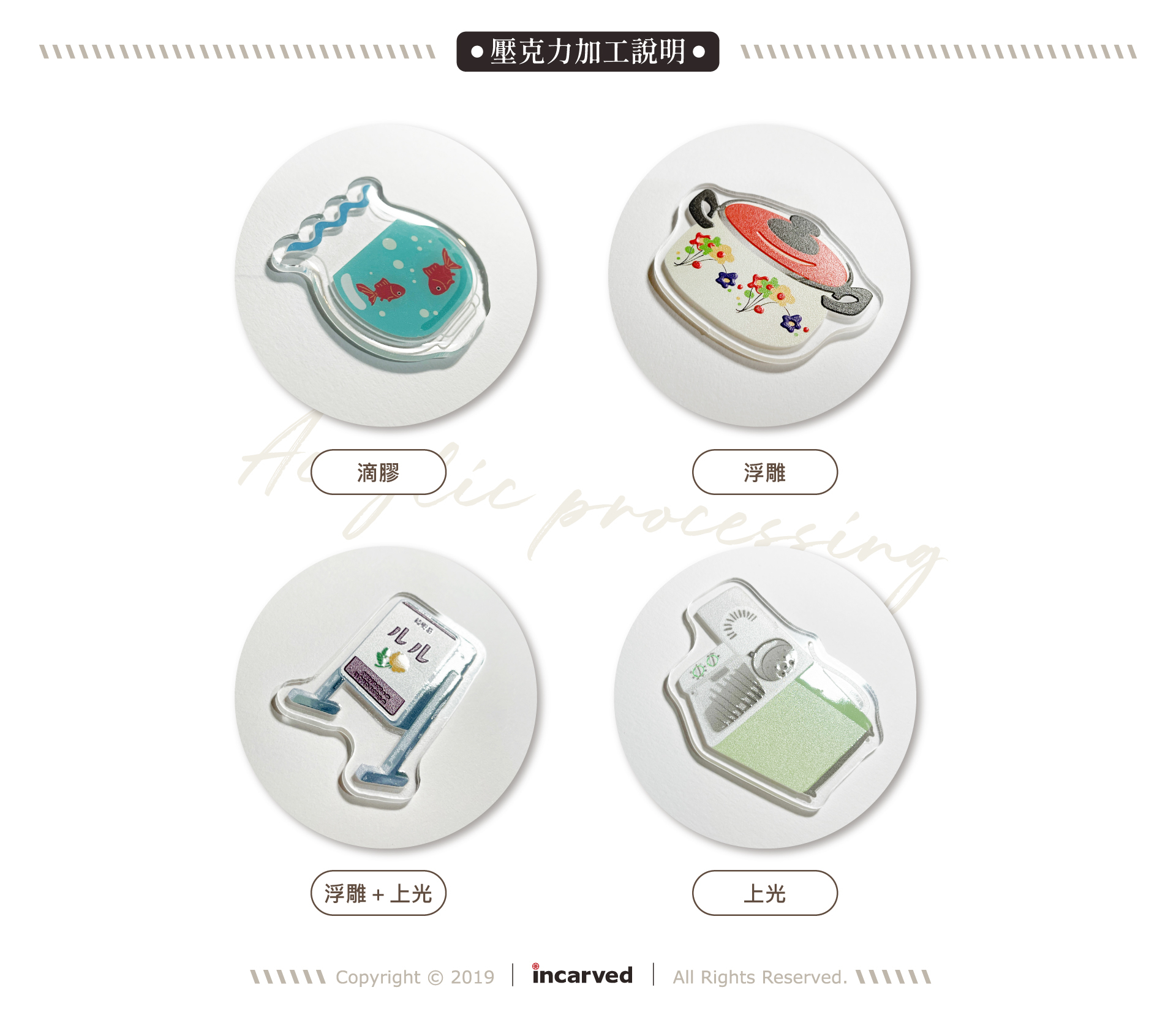 • 壓克力加工:上光、浮雕、上光+浮雕 會於局部加工,圖檔如沒有指定將會由我們幫您製作適合位置,如需要指定位置請製作黑稿圖層(如上光+浮雕,請分