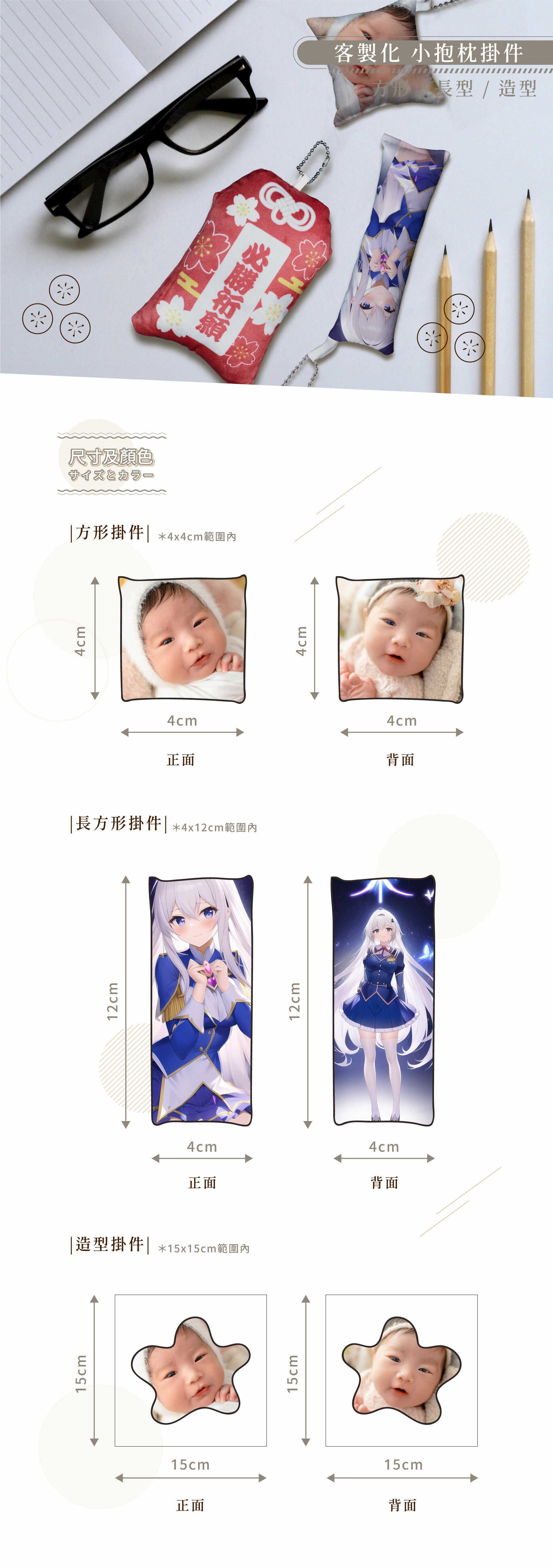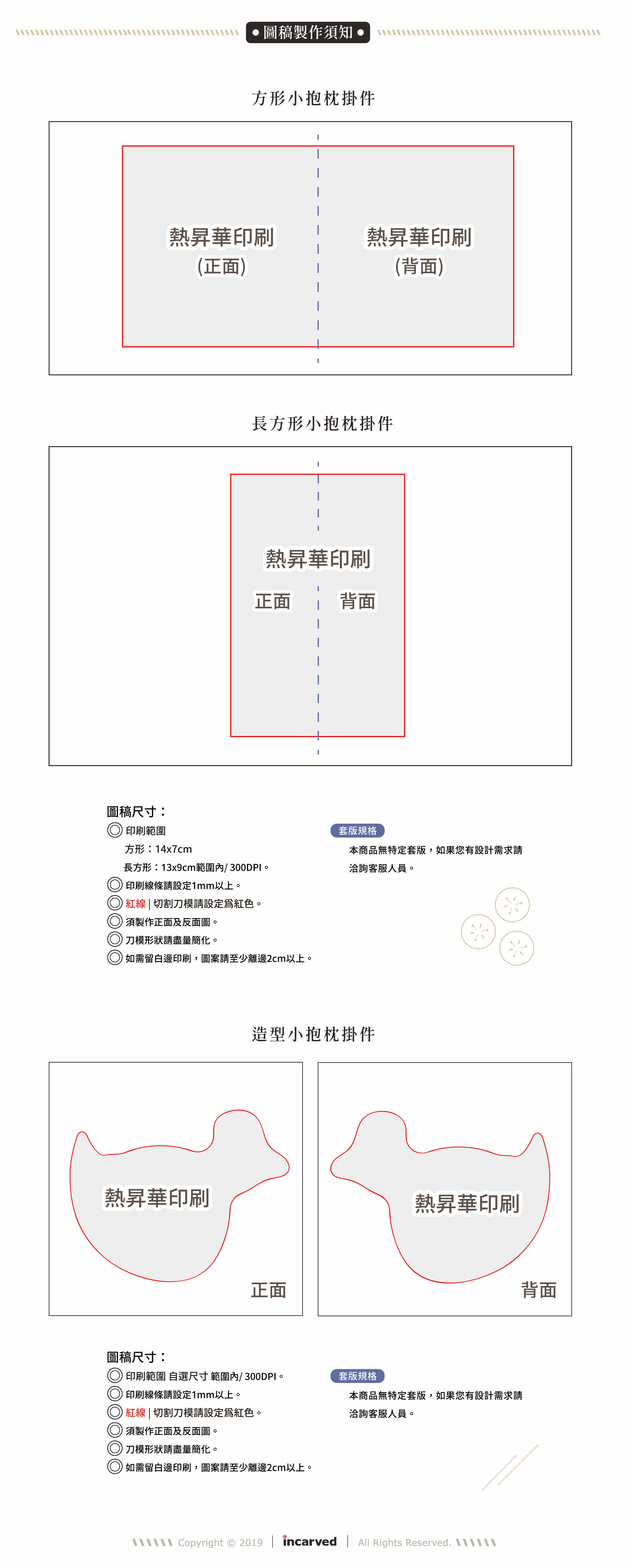 • 提醒您,車縫充綿後尺寸可能會產生±1公分誤差,製作圖稿時,請自行確保重要圖形離車縫邊至少1公分距離,另外需再做預留出血0.5公分。