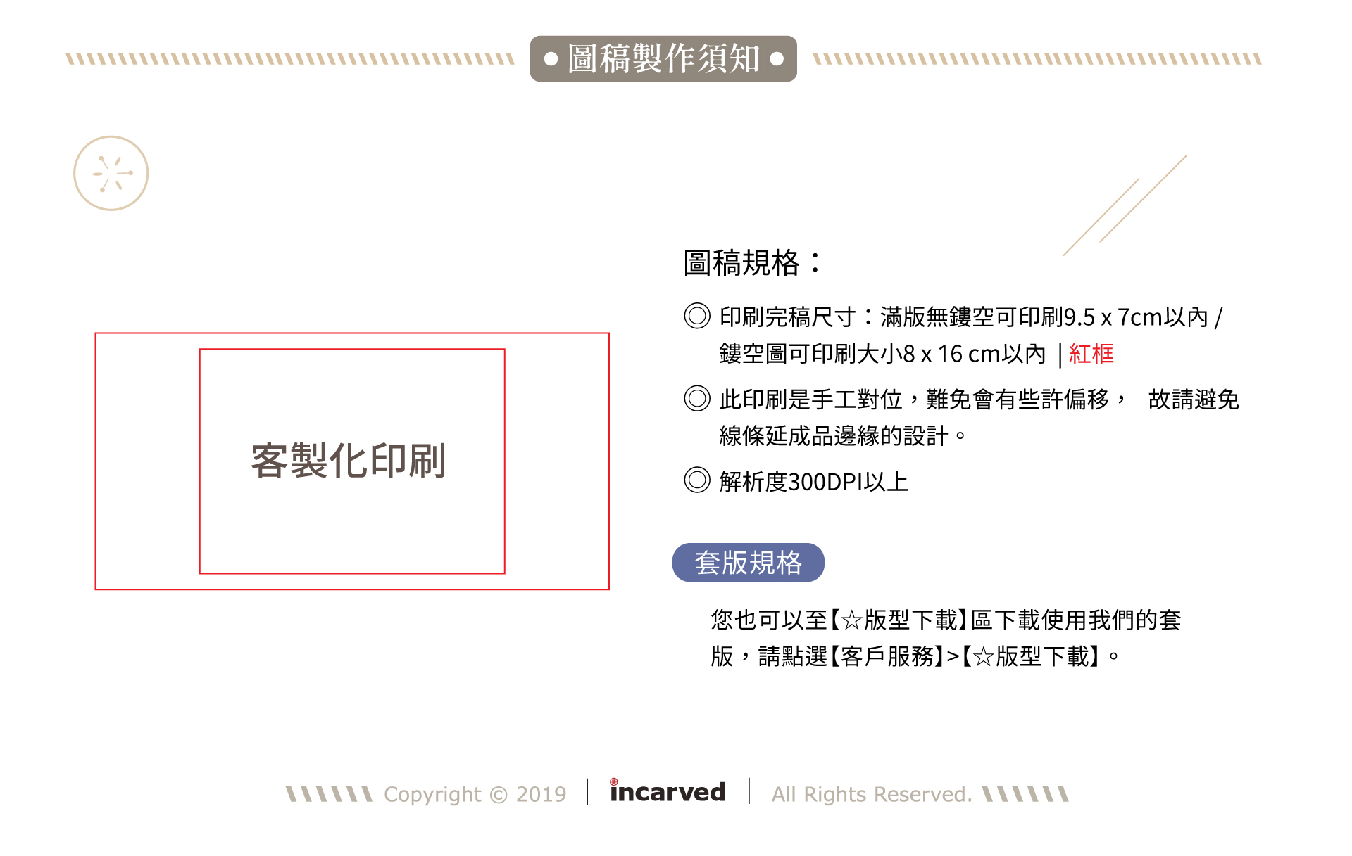 • 印刷完稿尺寸:滿版無鏤空可印刷9.5*7cm以內 / 鏤空圖可印刷大小8*16 cm以內 。