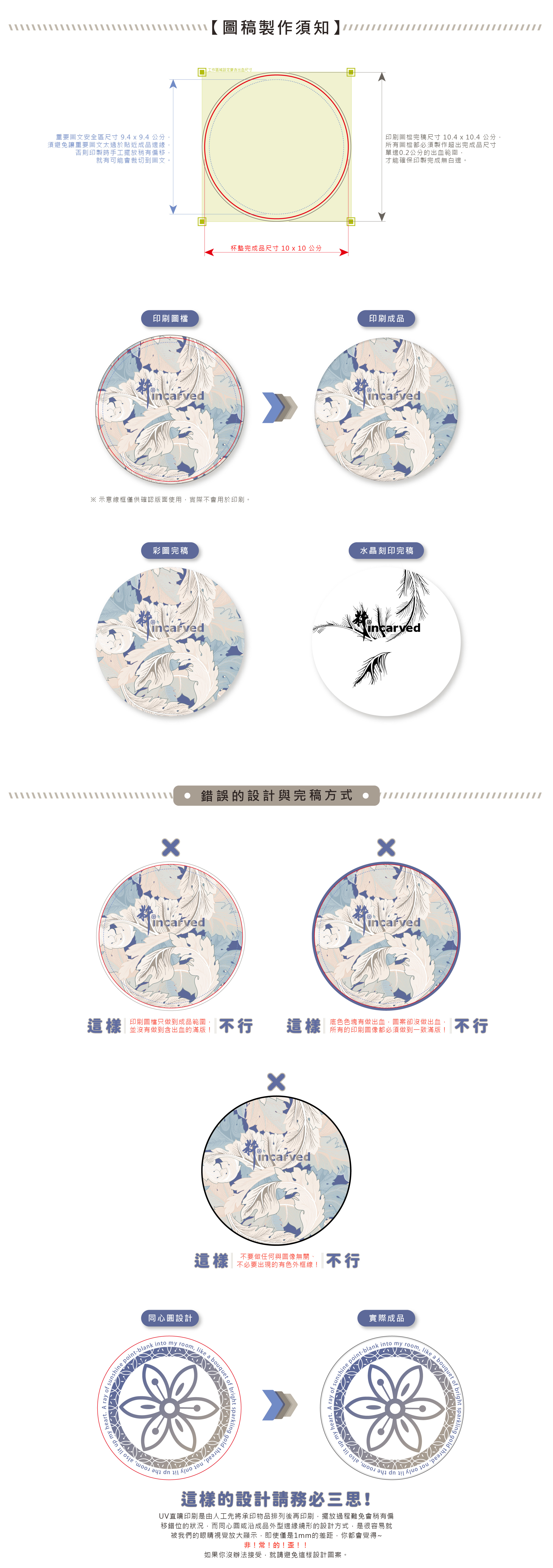 • 提醒您,直噴印刷是手工對位,難免會有些許偏移,故請避免同心圓的設計(或線條延成品邊緣的設計)。