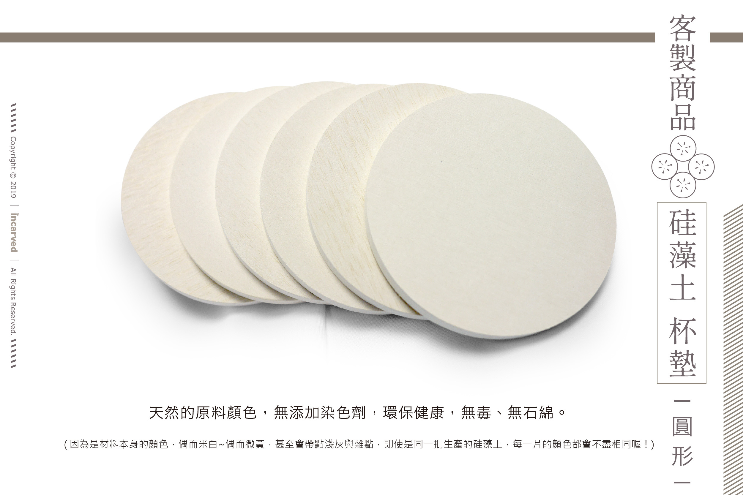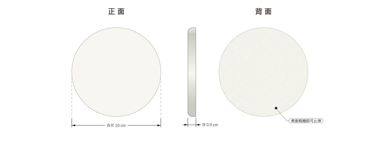 • 因硅藻土本身材質特性,印製大面積純色、灰色、深色色塊,容易出現色塊不均勻的狀況,並非印刷不良或瑕疵,若您十分在意,請自行斟酌設計或改選擇訂製陶瓷吸水杯墊。