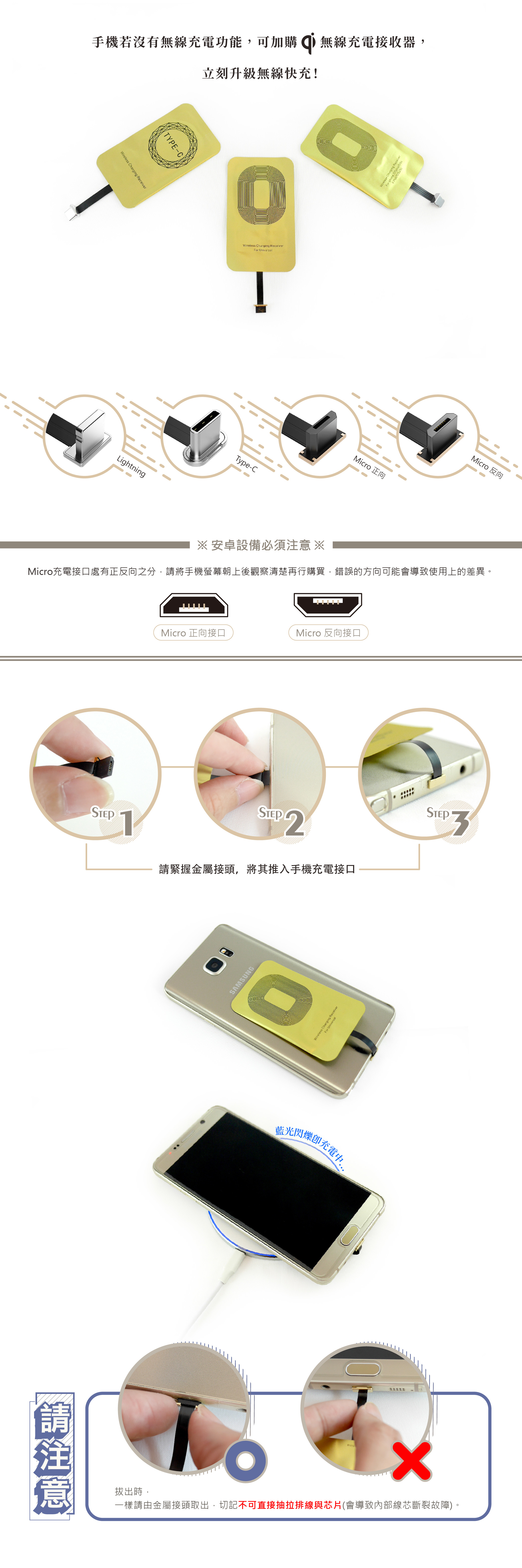 ※如需加購 Qi 無線充電接收器,請洽客服並說明需求款式:1. Lightning:230元 2.Type-C:230元 3.Micro (正向 / 反向):210元