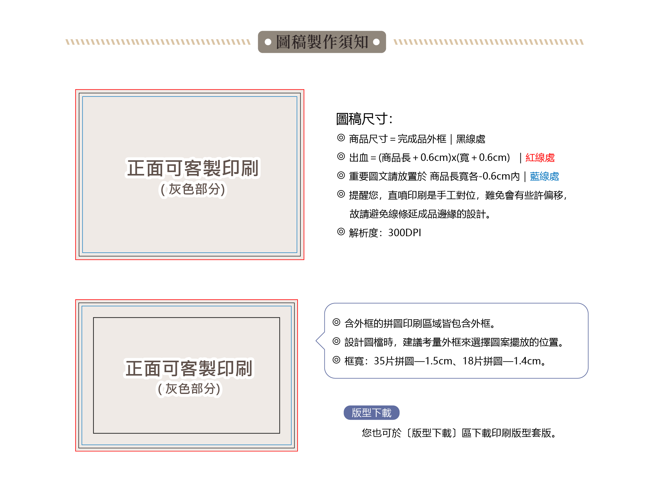 • 製作有框拼圖檔案時,建議將重要圖文放置於拼圖框內(拼圖框寬度:約為1.5cm)。