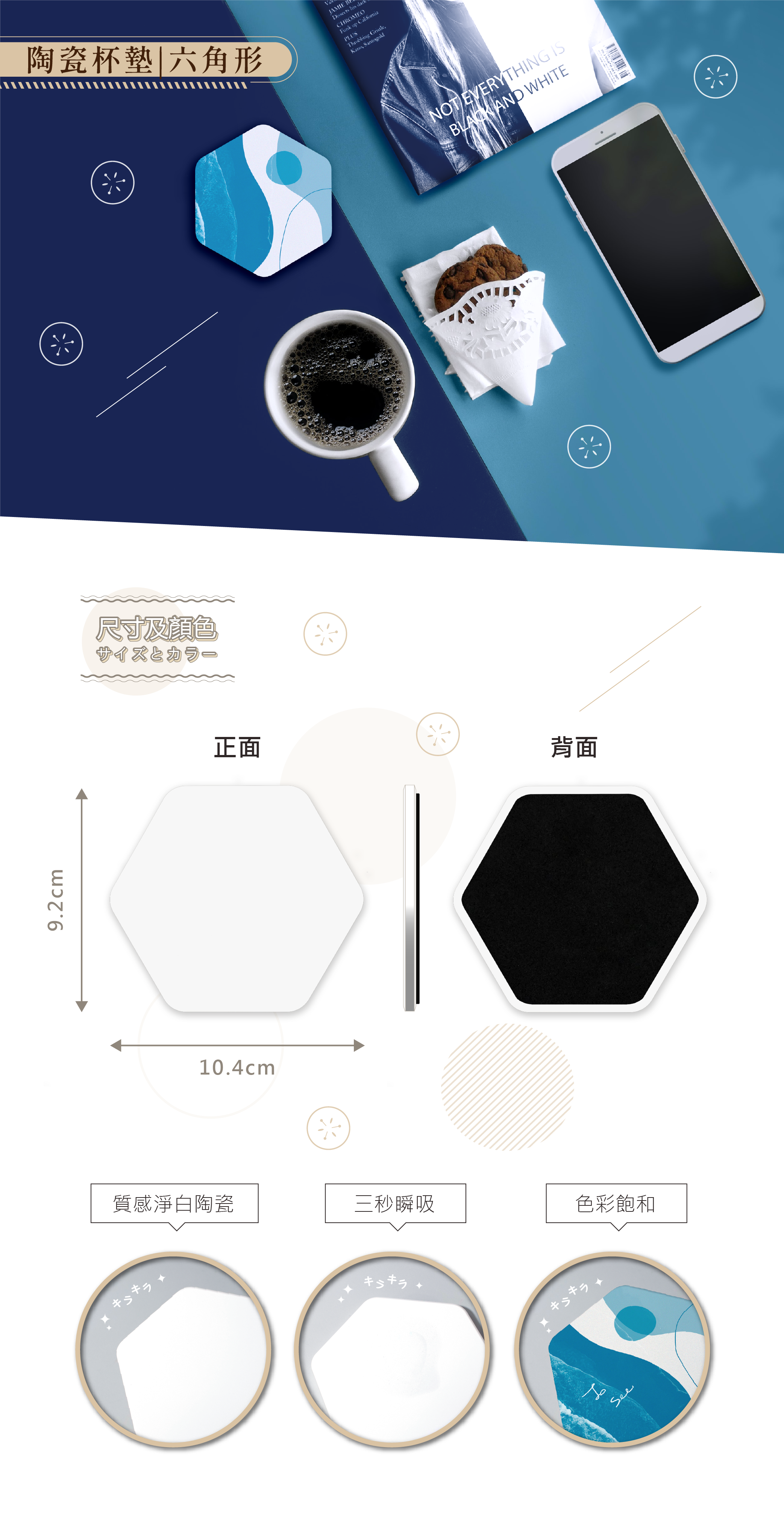 我們的陶瓷吸水杯墊是使用台灣鶯歌生產的淨白素胚下去製作,比其他鶯歌白胚更加潔白細緻。