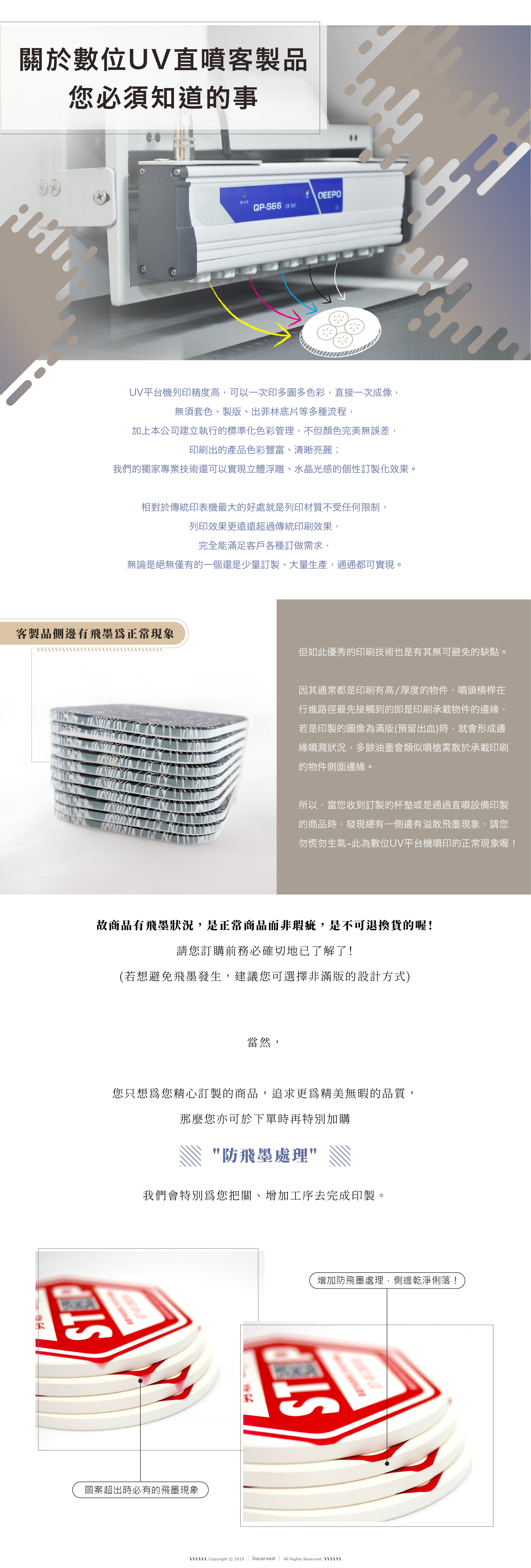 * 印刷之後發現表面明顯不均勻、類刮痕不能打掉重印嗎? 陶瓷杯墊並非"精密"工業,每一批次出廠品質多少還是會有所不同,而同一批次會有的狀況也可能幾乎每一片都有,這種關於材質本身造成的問題,我們孰難避免,也請您可以接受再行下單。