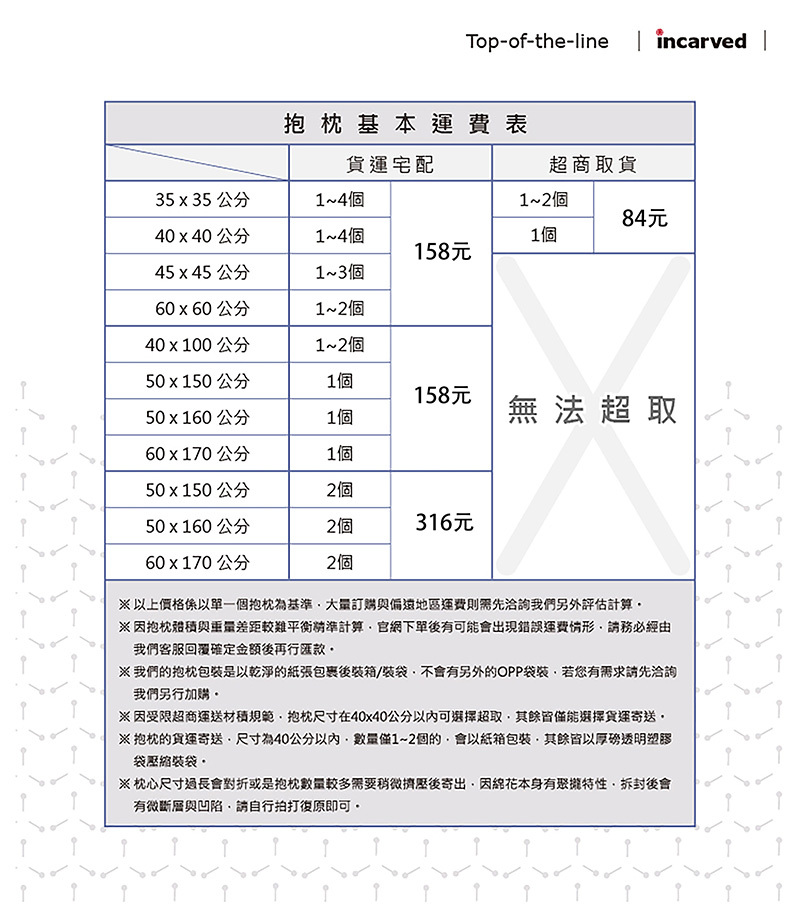 • 因受限於超商運送材積規範,抱枕尺寸在40x40公分以內可選擇超取,其餘皆僅能選擇貨運寄送。